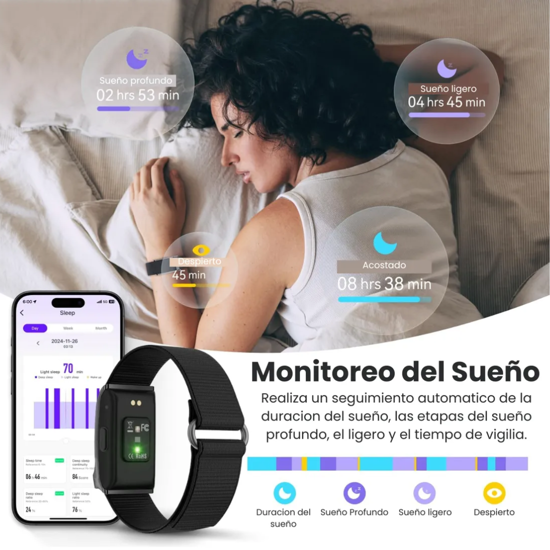 -Diseño compacto y ultraliviano (22 g), casi imperceptible incluso al dormir.